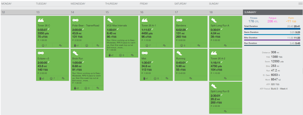 As a further illustration, the below screenshots from my TrainingPeaks account provide a good overview of what a typical early and late season training week look like.
